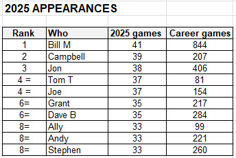 News Appearance stats for 2025 are now on player profiles. We lost 1 game due to the weather but none due to player numbers - the participation of our mostly Moroccan Ryanair friends had a lot to do with that! We played 50 games, one more than we did in 2024. Here are the top 10 appearances for 2025: ![]() Gaffer Bill and Campbell have swapped