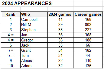 ![]() Appearance stats for 2024 are now on player profiles. We lost 1 game due to player numbers but still managed to play 49 games, 2 up on last year. Here are the top 10 appearances for 2024: ![]() Campbell claims top spot for the